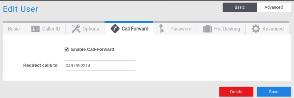 3 – Check “Enable Call-Forward” to activate call forwarding to the number in “Redirect calls to”.  These two fields will reflect changes made via a phone.