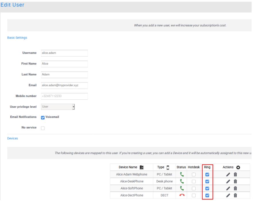 A user can have multiple devices assigned to him. Sometimes it is convenient to choose which devices will ring when he is called.