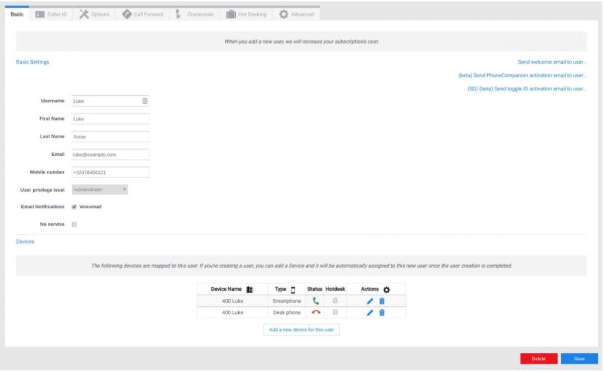 Important : You must make sure the user is not in use in any callflows before you can delete them.